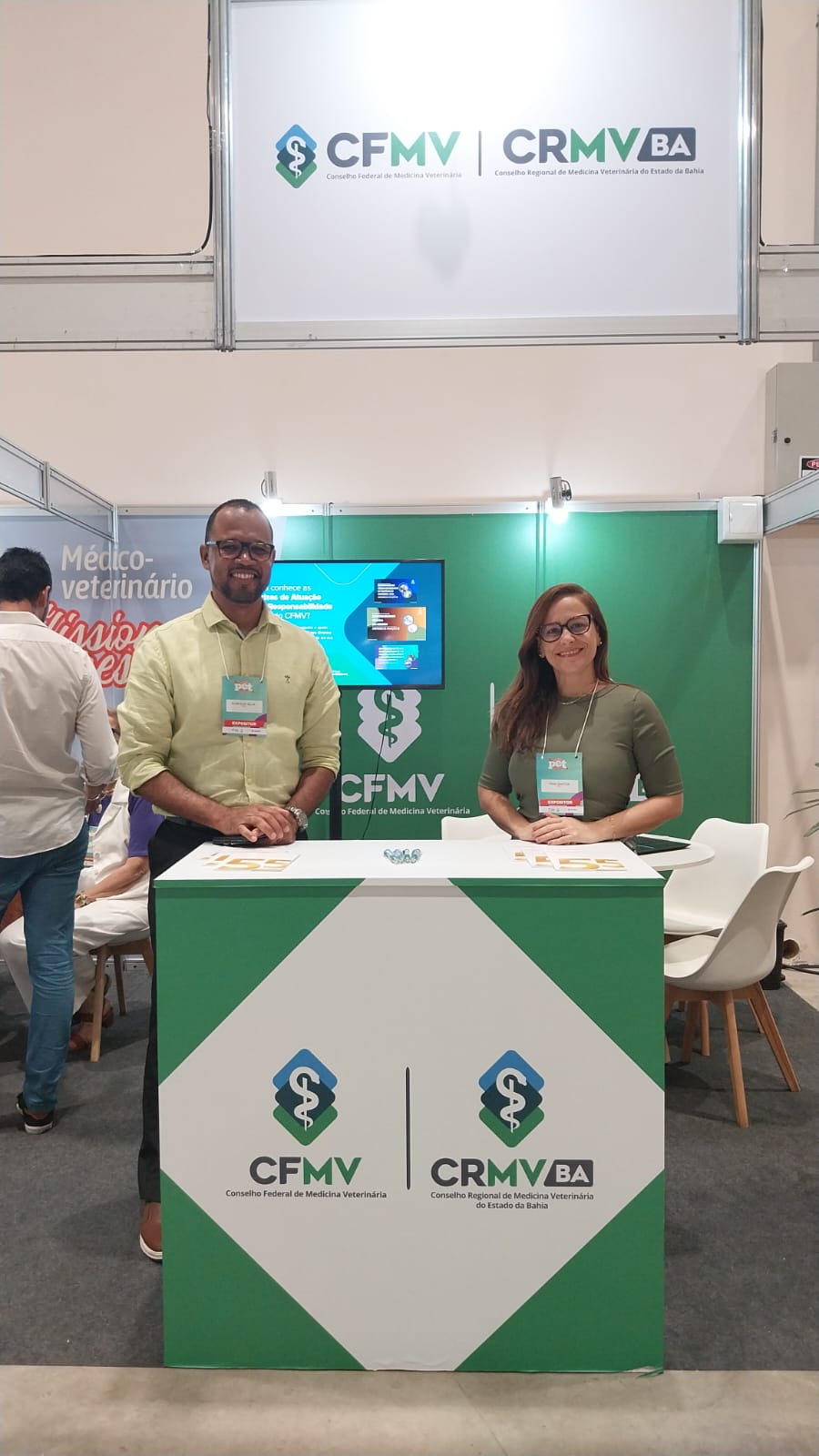 Espaço de informações, serviços e de redes de trabalho, o stand do CFMV-CRMV/BA ficou movimentado durante todo o evento, com as presenças e visitas dos presidentes do Federal e do Regional, diretores, conselheiros e colaboradores do CRMV/BA. Foram entregues 95 cédulas de identidade profissional, realizados recadastramentos, atualizações cadastrais, prestadas informações sobre cadastro de ART e sobre primeira inscrição no Conselho. Estudantes, profissionais e representantes de empresas passaram pelo stand para tirar dúvidas e estabelecer contatos profissionais.